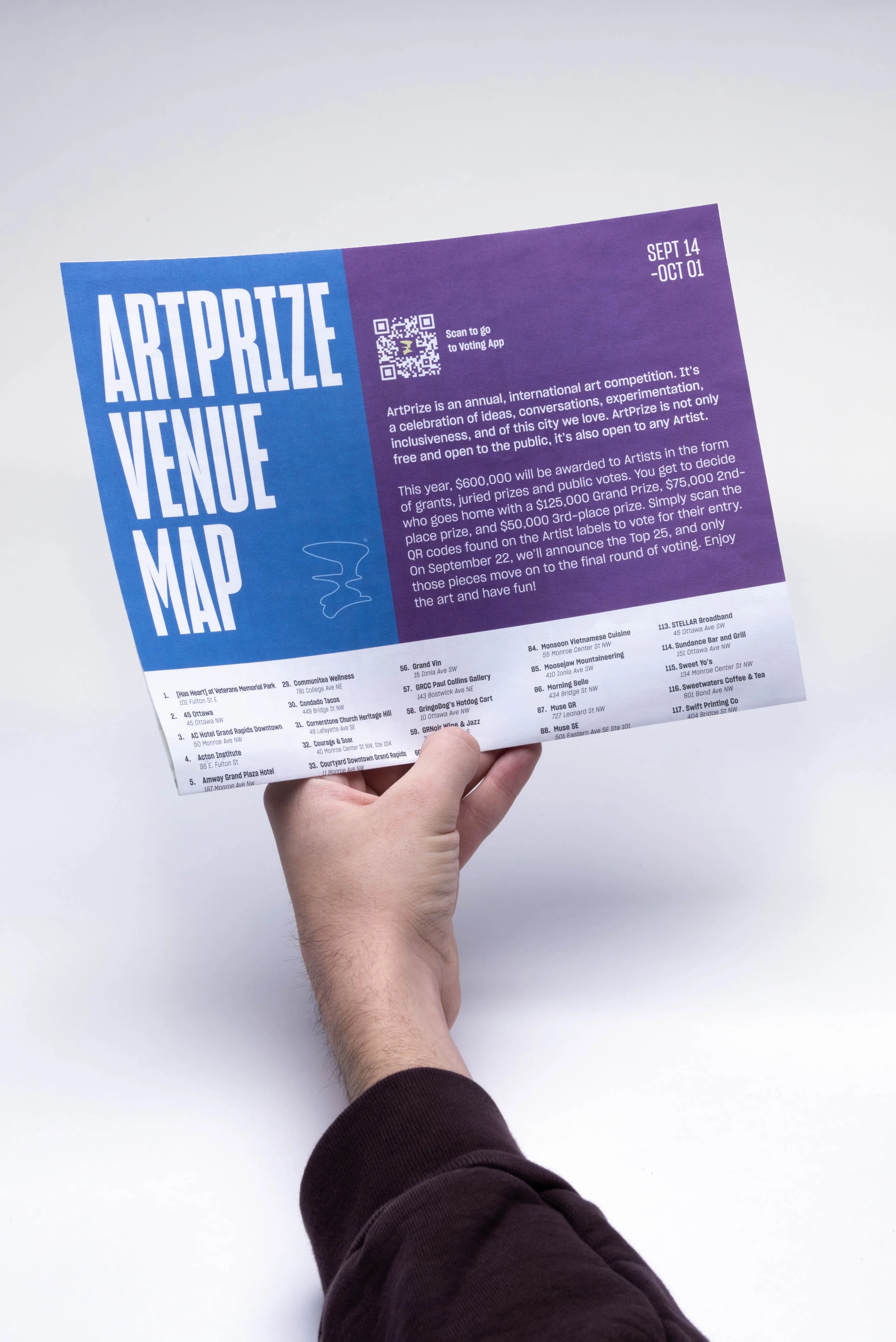 ArtPrize is an annual international art competition held in Downtown Grand Rapids, MI. Artwork is displayed in public spaces, local businesses, and galleries. The goal is to make art more accessible to the public and build community. This is done by providing educational materials to visitors and school field trips.